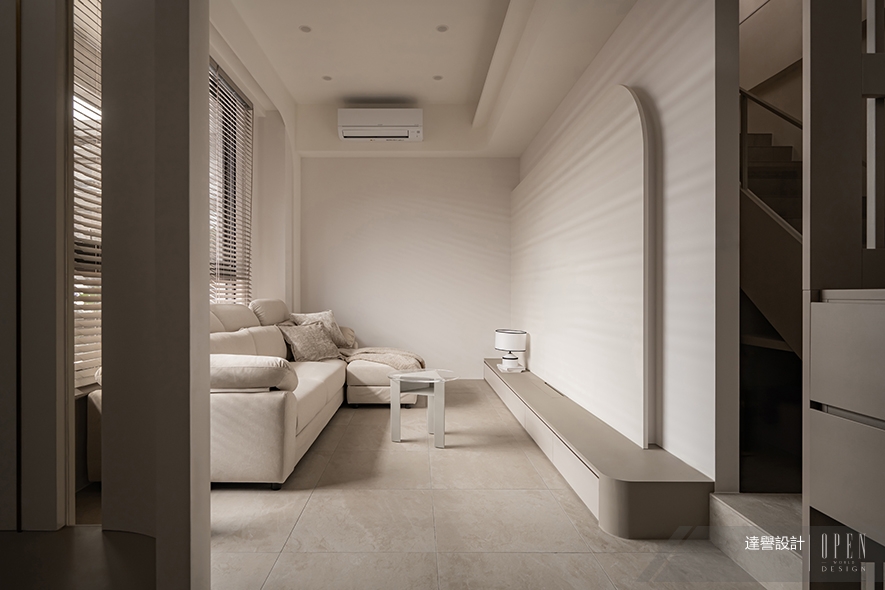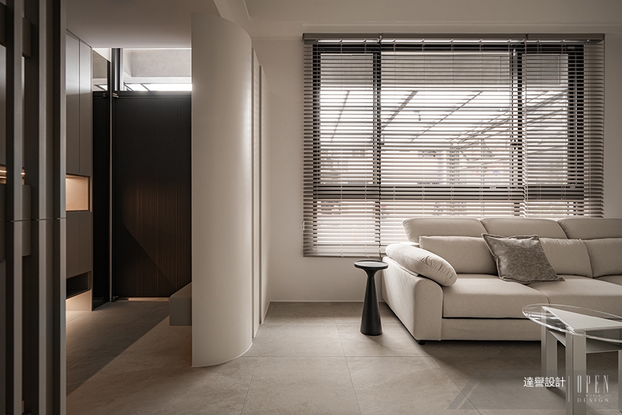 玻璃磚的透、弧牆的收、百葉的濾,在 達譽設計團隊 的細膩鋪排下,各自承接起採光、動線與收納的空間主軸。每處選材都甘於退讓,安靜融入起居的背景;當設計不再被刻意凝視,空間本身便化為最真摯的暖語,為親愛的歸人,砌一座簡練換取安心、用餘裕承載生活的棲居之所。